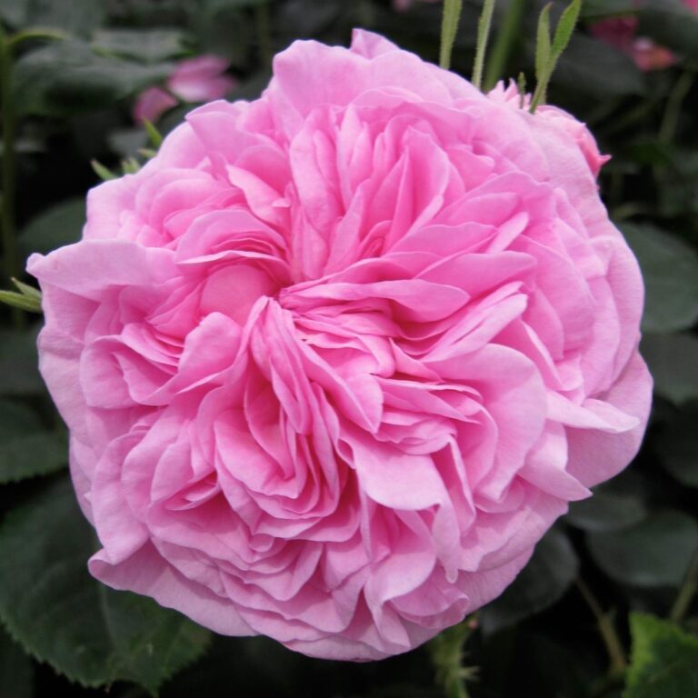 Rosa Antica damascena con fiori doppi divisi in quadranti di un colore rosa vivo.