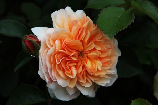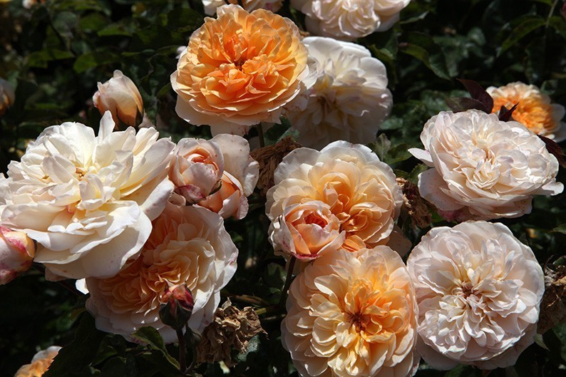 Una rosa dalle dimensioni contenute che produce fiori color albicocca con petali tendenti al panna verso l’esterno.