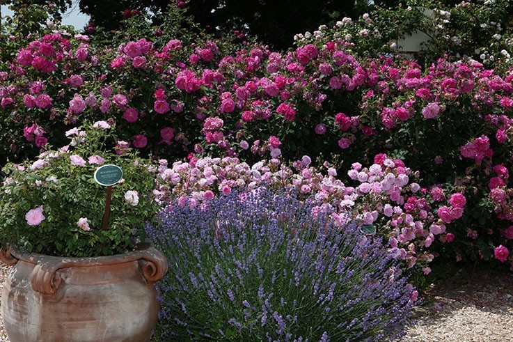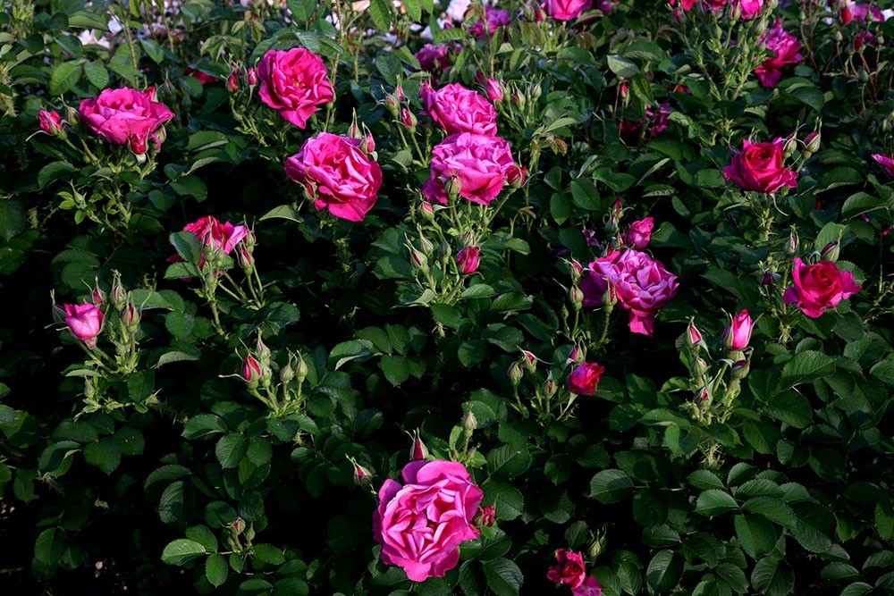 I boccioli appuntiti si aprono in fiori semidoppi di un rosa intenso e vellutato che lasciano intravedere gli stami dorati.